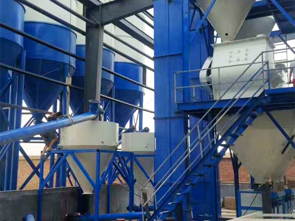 干粉砂漿設備的設備組成及其成品組成分別是怎樣的? 干粉砂漿設備主要由儲料罐,雙軸無重力混合機,提升機,待混倉,小料倉,成品倉,包裝秤,斗提機,除塵器,全自動計